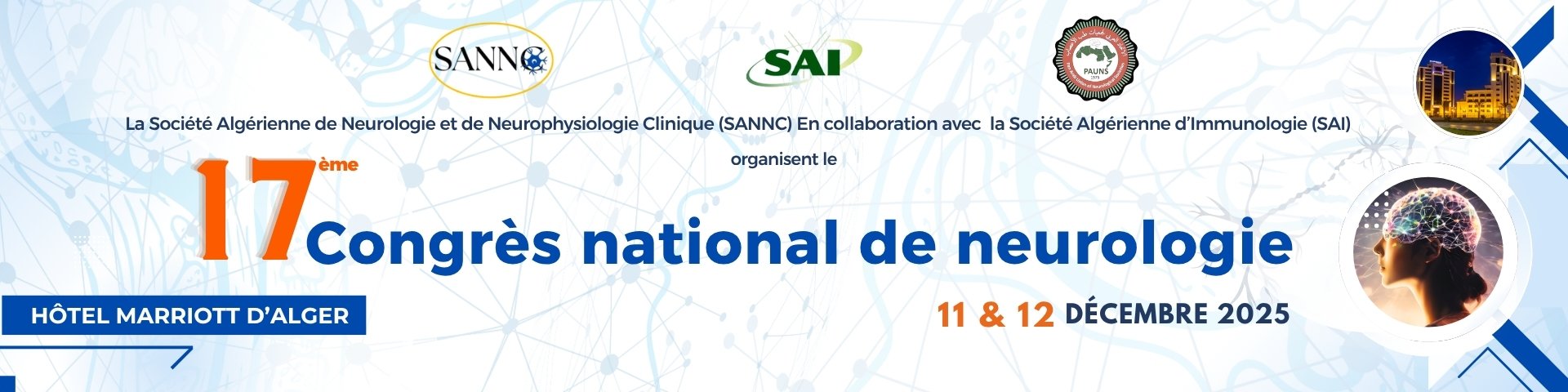 La Société Algérienne de Neurologie et de Neurophysiologie Clinique (SANNC) En collaboration avec la Société Algérienne d’Immunologie (SAI), est ravie de vous annoncer son 17ᵉ Congrès National qui se tiendra les 11, 12 décembre 2025 à l’hôtel Marriott d'Alger.